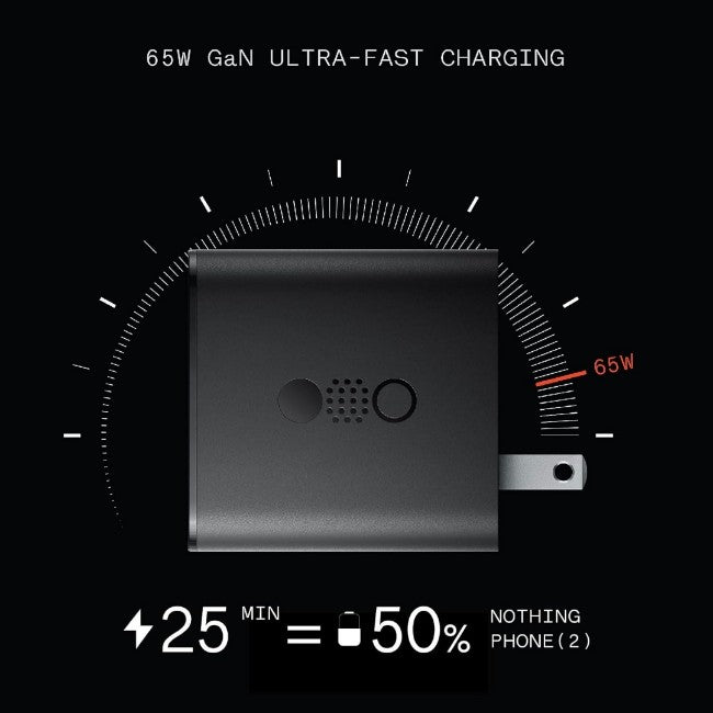 Powered by the latest GaN tech for the fastest, safest, and most energy-efficient charging experience. Featuring robust thermal conductivity and high-temperature resistance. Works hand-in-hand with a chip that can intelligently adjust voltage and current. The result is a powerhouse that can charge the Nothing Phone (2) smartphone up to 50 percent within 25 minutes.