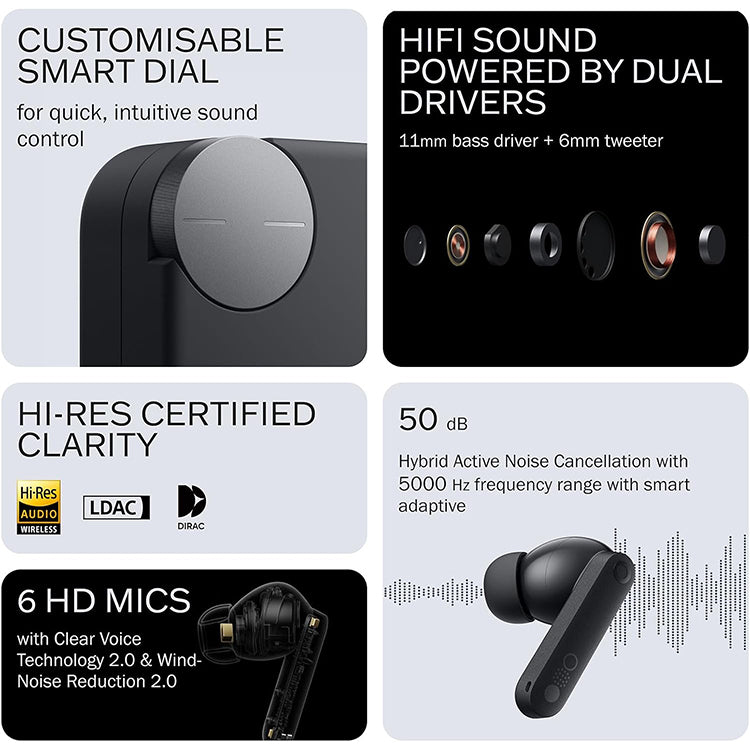 Immerse yourself in crystal-clear audio with Hybrid Active Noise Cancellation (ANC) up to 50 dB and a 5000 Hz frequency range. Block out distractions β from conversations to city noise β for uninterrupted focus and deep listening.