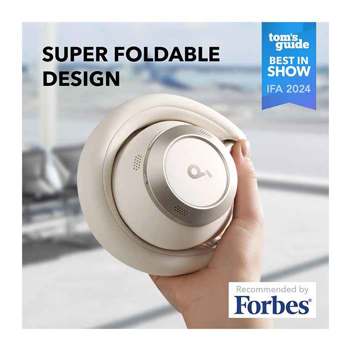 Soundcore by Anker Space One Pro Adaptive ANC headphones in white deliver travel-ready, high-resolution wireless sound in a sleek, minimalist design that fits perfectly into modern workspaces, flights, and daily commutes.