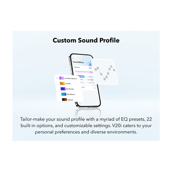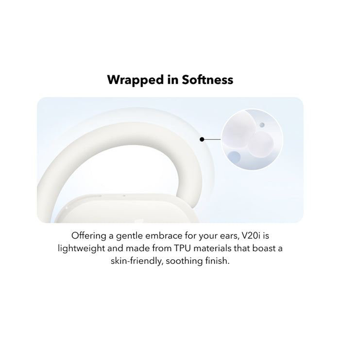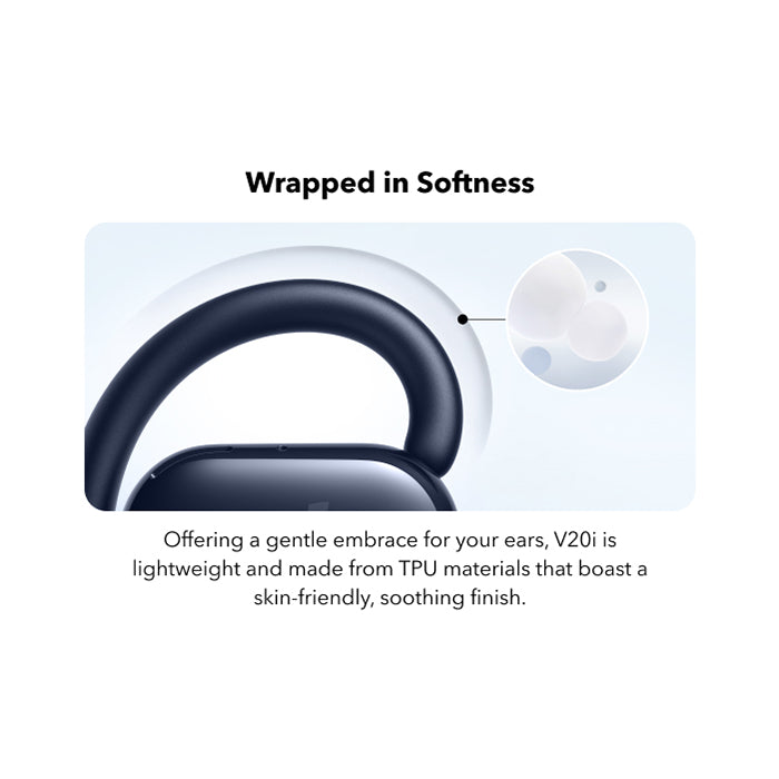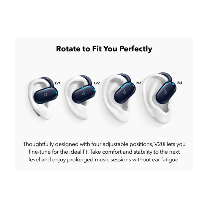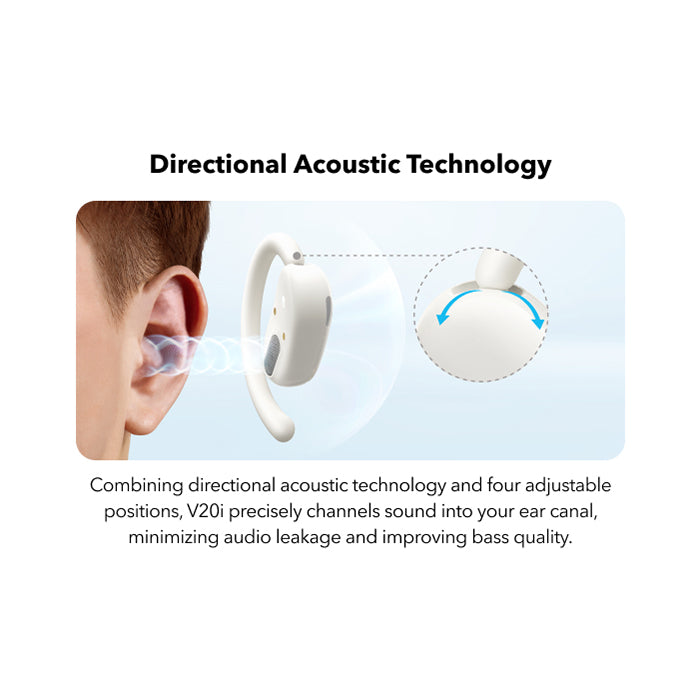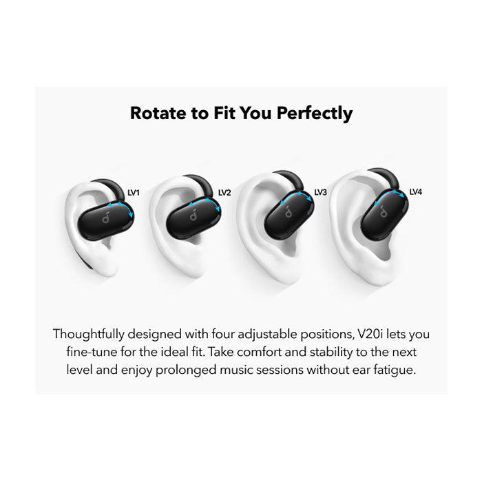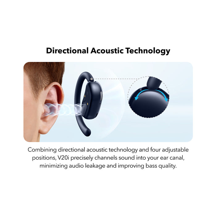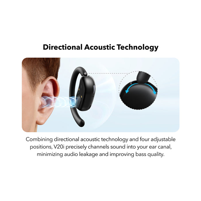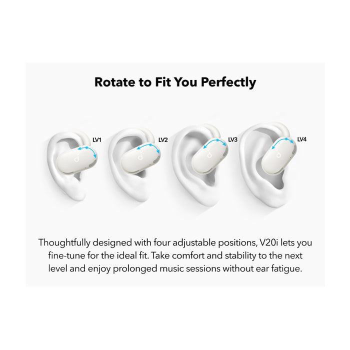 Forget the discomfort of traditional earbuds. The V20i features an **ultra-comfortable open-ear design with four adjustable positions**. Easily rotate the ear hooks to find the perfect, secure fit for your ears, ensuring they stay put no matter how active your day gets. Experience matchless comfort even during extended listening sessions, making them ideal for long commutes or work-from-home setups.